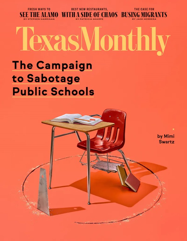 “They” say the depredations of age get each of us eventually, and maybe that’s responsible for what feels like my increasingb530dca6-86c1-4d7b-9fd1-e6ebb1bf3b41 inability to think of just the right word on short notice.  But whatever the cause, I owe a big thanks to whoever wrote and approved the headline on the March cover of Texas Monthly: “The Campaign to Sabotage Public Schools” hit perfectly as the word to describe the effort I’ve witnessed for years as radical evangelical Christians have undermined Texas public schools while insisting they are trying to save them.  Butter wouldn’t melt in their mouths.