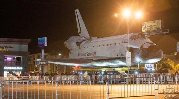 By turns, this video is remarkable, unbelievable, inspiring, comical, and by the end very very sad, as the object of our attention first comes face to face with its new home, something that looks for all the world like a gigantic aluminum garden shed.  From the Los Angeles Times, click the pic for an outstanding time-lapse view of space shuttle Endeavour being moved from Los Angeles International Airport through the city streets to the California Science Center, where it goes on permanent display.